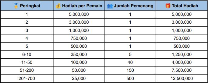2. Total hadiah Rp 2,5 MILIAR akan dibagikan kepada 5.000 Pemain setiap hari selama periode promo berlangsung.